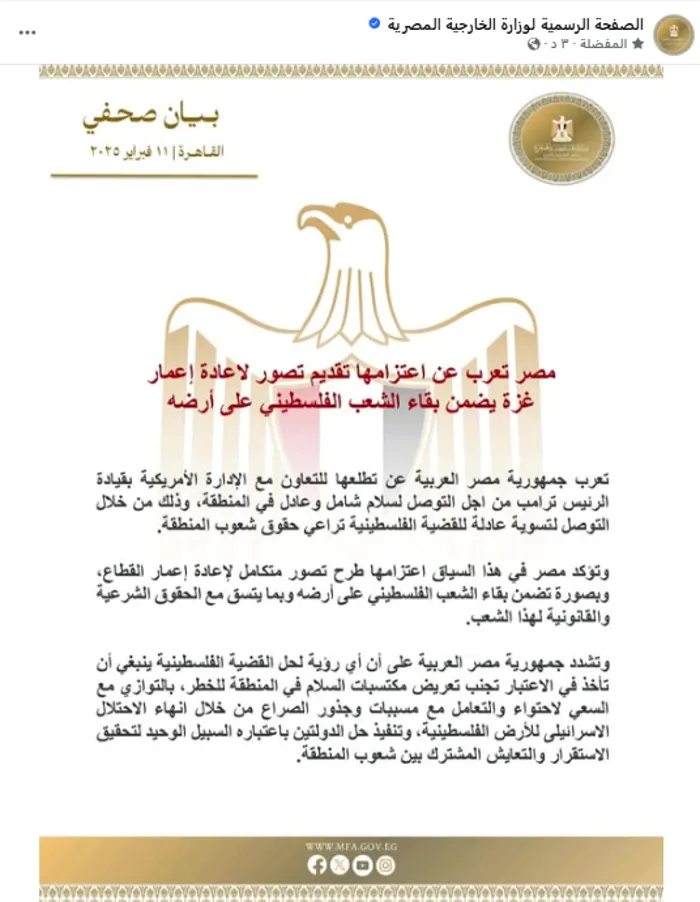 وأكدت مصر في هذا السياق اعتزامها طرح تصور متكامل لإعادة إعمار القطاع وبصورة تضمن بقاء الشعب الفلسطيني على أرضه وبما يتسق مع الحقوق الشرعية والقانونية لهذا الشعب.