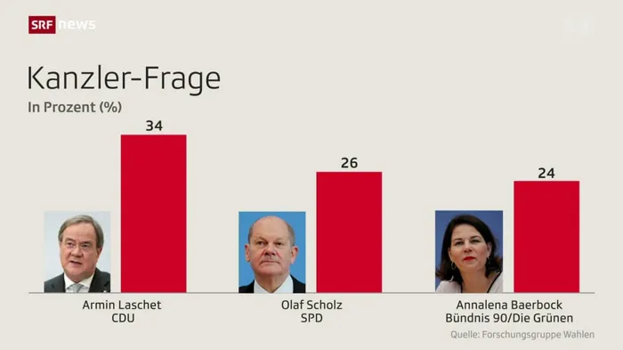 وفي استطلاعات الرأي التي سبقت انتخابات 2021 بشهر واحد، تنافس فيها كل من أولاف شولتس (نائب المستشارة أنجيلا ميركل) آنذاك، وأرمين لاشين مرشح حزب الديمقراطي المسيحي، وأنالينا بيربوك مرشحة حزب الخضر ووزيرة الخارجية الحالية، حصل مرشح الاتحاد على 34%، قبل شهر، في حين حصل منافسه من الحزب الاشتراكي الديمقراطي على 26%، وجاءت بيربوك ثالثًا، بـ24% بحسب صحيفة "راينشه بوست".