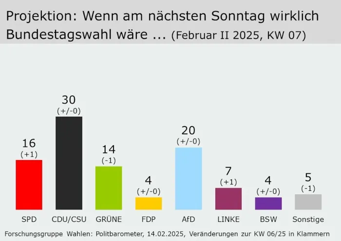 ويتصدر زعيم المعارضة فريدريش ميرز، رئيس حزب الديمقراطي المسيحي، استطلاعات الرأي بنحو 27%، وتليه مرشحة حزب البديل لألمانيا بنحو 20%، بينما يحل المستشار الحالي مرشح الحزب الديمقراطي الاجتماعي بـ17%، ويقف روبرت هابيك، مرشح حزب الخضر في رابع الترتيب بـ12%.