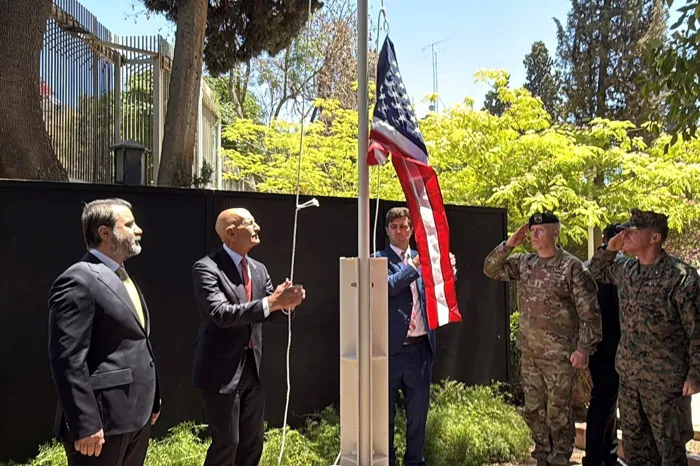 رفع المبعوث الأمريكي الجديد في سوريا توماس باراك، العلم الأمريكي، اليوم الخميس، خارج مقر إقامة السفير المغلق منذ فترة طويلة بالعاصمة السورية، في دلالة على تنامي العلاقات بين واشنطن والحكومة السورية الجديدة.