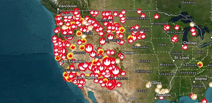 وقامت هيئة الأرصاد الوطنية الأمريكية بإصدار تحذيرات من الدرجة الحمراء في خمس ولايات، وهم يوتا ونيفادا وأريزونا ووايومنج وأيداهو، وسط صعوبة السيطرة على حرائق الغابات في جميع أنحاء الساحل الغربي، محذرين من أن سرعة الرياح البالغة 30 ميل في الساعة قادرة على تأجيج عشرات الحرائق.