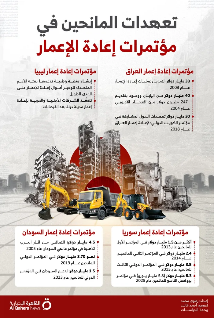 وفي مؤتمرات إعادة إعمار سوريا كان حجم التعهدات أقل من حجم الاحتياجات، ففي المؤتمر الثاني للمانحين حول سوريا، كان المجتمع الدولي يعول على جمع نحو 6 مليارات دولار، لكن لم يصل حجم التعهدات في هذا المؤتمر إلى أكثر من 2.4 مليار دولار، وفي عام 2025 انخفض إجمالي تعهدات المانحين بنسبة 20% مقارنة بعام 2024، وهو الحال في السودان فقد تم رصد نحو 9.7 مليار دولار من عام 2005 إلى 2023، ولم يصل جزء كبير منها إلى السودان، إضافة إلى ذلك ينخفض هذا الرقم بشكل كبير عن خسائر الاقتصاد السوداني التي تُقدر بنحو 600 مليار دولار.
