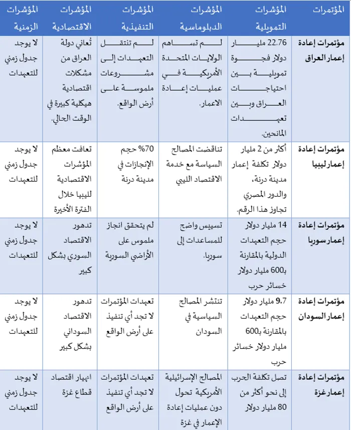 يُمكن التعرف على حدود نجاح مؤتمرات إعادة الإعمار من خلال المؤشرات التالية، التي تتلخص في الجدول (1):