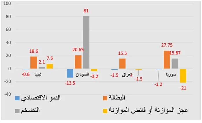 (-) المؤشرات الاقتصادية: إن تحسُن مؤشرات الاقتصاد المحلي من نمو واستثمار وفرص عمل، تُعد دليلًا كبيرًا على نجاح مؤتمرات إعادة الإعمار، والعكس صحيح، وبقياس ذلك على الاقتصاد العراقي والليبي والسوري والسوداني، يتضح من الشكل (1) أن الاقتصاد الليبي أكثر الاقتصادات التي تعافت، فقد سجل التضخم بها 2.1%، مقارنة بـ81% في السودان، و15.87% في سوريا، وهي الدولة التي حققت فائضًا حكوميًا قدره 7.5%، في حين حققت الدول الأخرى عجزًا، بنسبة أكبر في سوريا (21-%)، على الرغم أنها من الدول التي انعقدت لها العديد من مؤتمرات إعادة الإعمار.