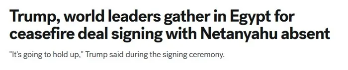 وأضافت الشبكة أن ترامب شارك في مؤتمر السلام بشرم الشيخ المصرية مع زعماء 20 دولة، ووقف لالتقاط الصور أمام لافتة كُتب عليها "السلام في الشرق الأوسط". ووقّع الرئيس الأمريكي على وثيقة إنهاء الحرب في غزة.