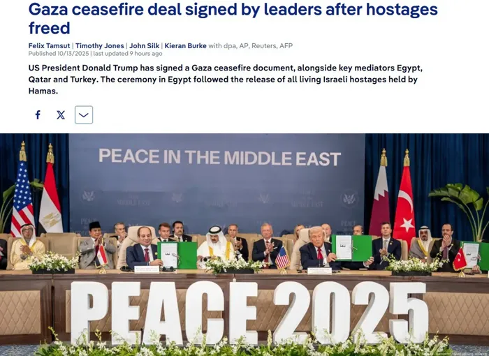 أبرزت وسائل الإعلام العالمية توقيع وثيقة إنهاء الحرب الإسرائيلية على غزة في القمة الدولية للسلام التي عقدت في مدينة شرم الشيخ المصرية، حيث وقّع قادة مصر والولايات المتحدة وتركيا وقطر، وثيقة إنهاء الحرب في غزة، بالتزامن مع إطلاق سراح جميع المحتجزين الإسرائيليين الأحياء لدى حماس.