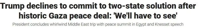 عندما سُئل عمّا إذا كان الاتفاق، الذي أدى إلى وقف إطلاق النار في غزة وعودة جميع المحتجزين الإسرائيليين إلى عائلاتهم، يمكن أن يؤدي إلى قيام دولة فلسطينية، قال ترامب: "نحن نتحدث عن إعادة بناء غزة". وأضاف: "أنا لا أتحدث عن دولة واحدة أو دولتين، نحن نتحدث عن إعادة إعمار غزة".