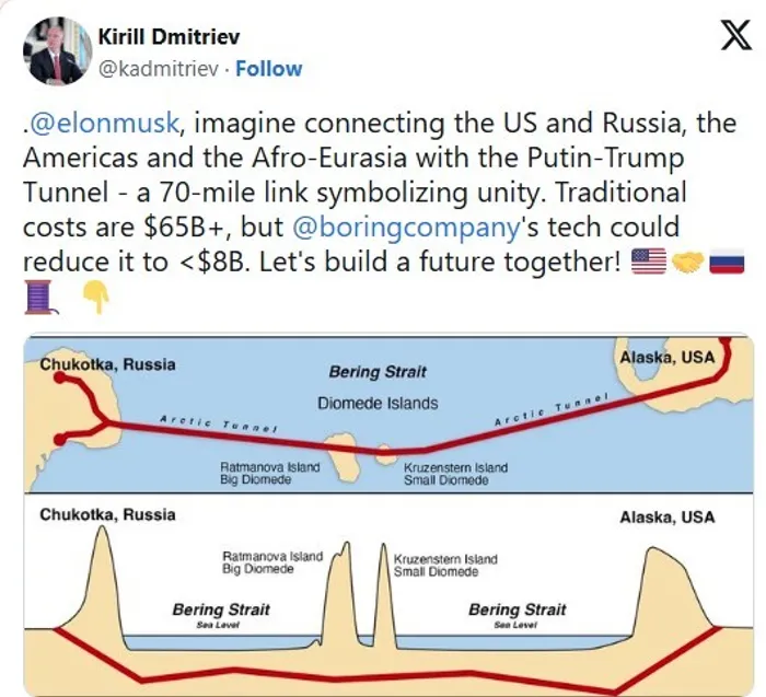 وكتب كيريل دميترييف، الرئيس التنفيذي لصندوق الثروة السيادية للكرملين والمبعوث الخاص للاستثمار، على منصة التواصل الاجتماعي "إكس"، أمس الخميس: "تخيلوا ربط الولايات المتحدة وروسيا، والأمريكتين، وأوراسيا الإفريقية بنفق (بوتين-ترامب).. رابط بطول 70 ميلًا يرمز إلى الوحدة".