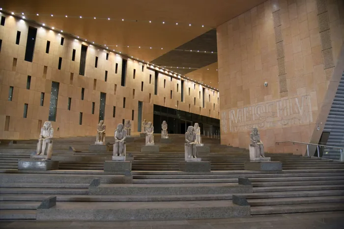 هنا لا تُشاهد فقط التماثيل، بل تشعر وكأنها تراقبك بنظرات من زمن بعيد تسألك هل ما زلتم تتذكروننا؟، ومع كل خطوة إلى الأعلى تتغير الإضاءة وتتبدل الألوان، حتى تصل ذروة المشهد، إذ تطل من خلف نافذة زجاجية ضخمة على الأهرامات الثلاثة، تلوح أمامك في مشهد لا يوصف، كأنك تشهد لقاءً بين الماضي والحاضر في آنٍ واحد.