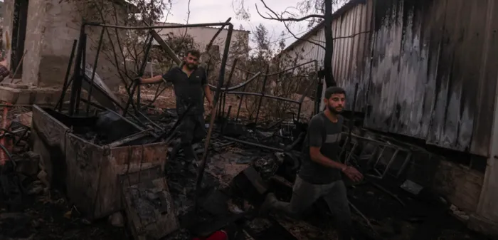 وتصاعدت الأدخنة في المنطقة المتضررة في عدة أماكن، مع صرخات عشرات النساء الفلسطينيات، في الوقت الذي كان فيه الفلسطينيون يحملون طفايات الحريق ودلاء المياه، ويهرعون لإخماد النيران التي أتلفت الأراضي الزراعية والبيوت والمحلات، واحترقت خيام وحظائر ماشية، إضافة إلى سيارات وشاحنات كاملة.