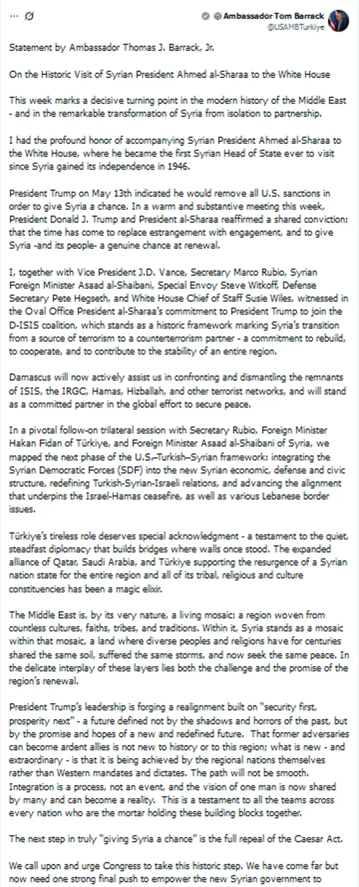 واختتم المبعوث الأمريكي بيانه بتحديد الخطوة التالية لـ "إعطاء سوريا فرصة حقيقية"، وهي الإلغاء الكامل لقانون قيصر، وناشد الكونجرس الأمريكي وحثَّه على اتخاذ هذه الخطوة التاريخية لتمكين الحكومة السورية الجديدة من إعادة تشغيل محركها الاقتصادي، وتمكين الشعب السوري وجيرانه الإقليميين ليس فقط من البقاء، بل من الازدهار أيضًا.