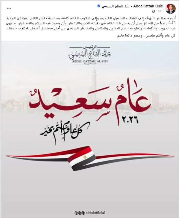 توجَّه الرئيس المصري عبدالفتاح السيسي بخالص التهنئة إلى الشعب المصري العظيم، وإلى شعوب العالم كافة، بمناسبة حلول العام الميلادي الجديد 2026.