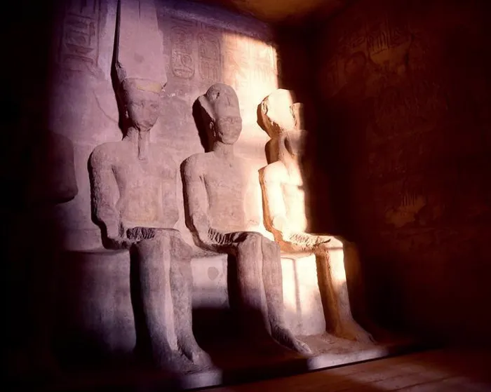 تضيء الشمس وجوه رع-حور آختي وآمون رع ورمسيس الثاني، بينما يظل تمثال الإله بتاح غارقًا في الظلام، في رسالة رمزية عميقة تعكس فلسفة المصري القديم عن الكون والحياة والموت. لم يكن هذا التوزيع عشوائيًا، بل تعبيرًا واعيًا عن عقيدة ترى في الضوء قوة خلق وتجدد، وفي الظلام عالمًا آخر له قداسته وهيبته.