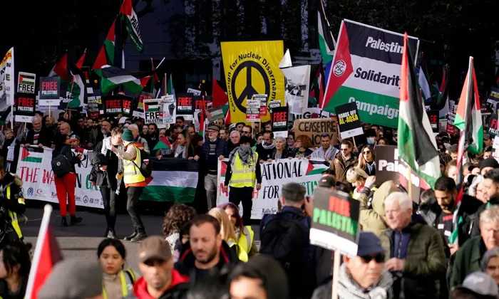 خرج مئات الآلاف من المتظاهرين في العاصمة البريطانية لندن، اليوم، من ماربل آرتش إلى منطقة ناين إلمز، بالقرب من السفارة الأمريكية، لدعم فلسطين ومعارضة أعمال العنف التي تشنها إسرائيل ضد المدنيين في قطاع غزة، حسبما ذكرت صحيفة "إندبندنت" البريطانية.