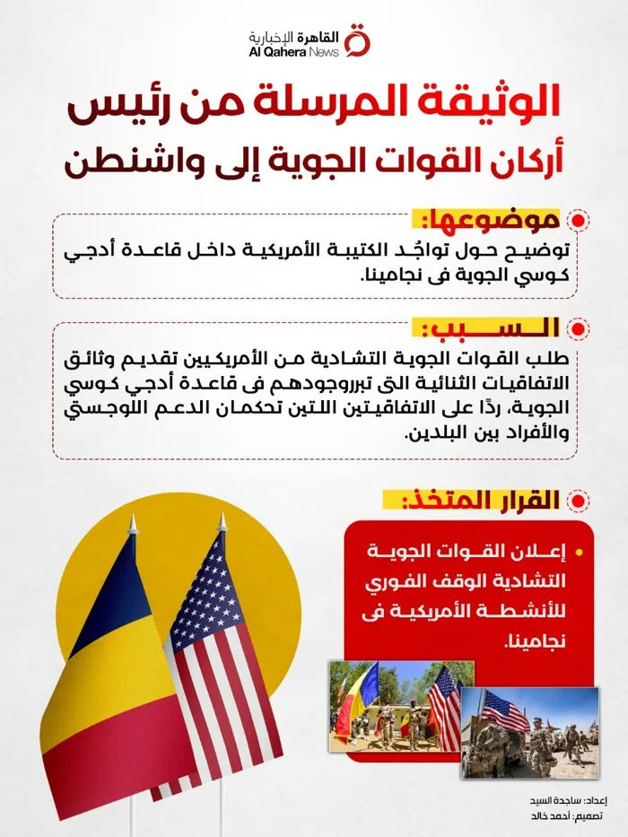 (*) الحديث عن خلاف بين مسؤولين أمريكيين وجنرال تشادي: أرسل رئيس أركان القوات الجوية التشادية "إدريس أمين أحمد" رسالة مؤرخة في 4 أبريل المنقضي، تم توجيهها إلى وزير القوات المسلحة الأمريكية، طالب خلالها الجيش الأمريكي إرسال نصوص الاتفاقيات الثنائية التي تبرر وجود القوات الأمريكية الخاصة في نجامينا، وردًا على ذلك، تم إرسال اتفاقيتين بين الدولتين من الطرف الأمريكي. لكن عقب الاطلاع على الاتفاقيتين، أعلنت تشاد عن فشل واشنطن في تقديم وثائق تبرر الوجود العسكري الأمريكي في نجامينا، وطلبت القوات الجوية التشادية من ملحق الدفاع الأمريكي الوقف الفوري للأنشطة الأمريكية في قاعدة "أدجي كوسي" الجوية في نجامينا، حتى بات الخلاف الأمريكي التشادي يدور حول عجز واشنطن عن إثبات واقعية الدور الأمريكي في تشاد.