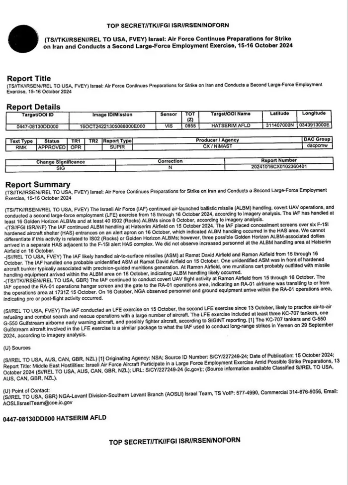 أما الوثيقة الأخرى، التي قيل إنها من إعداد وكالة الأمن القومي (NSA)، فتتناول تدريبات للقوات الجوية الإسرائيلية تتضمن صواريخ جو-أرض.