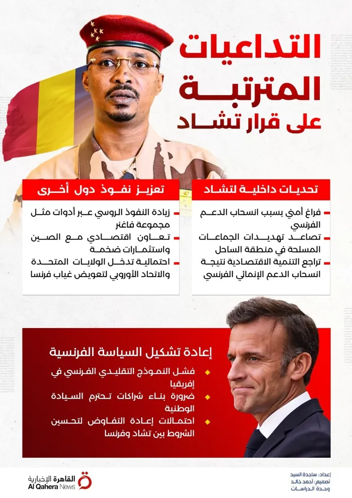 (*) تصاعُد الدور الروسي والصيني: من المتوقع أن يسهم القرار في تعزيز نفوذ روسيا والصين في تشاد وإفريقيا بشكل عام، فعبر أدواتها العسكرية، مثل مجموعة "فاجنر"، تعزز موسكو وجودها في القارة، ما يفتح المجال لتعاون أكبر بين تشاد والقوى الدولية الصاعدة. من جانب آخر، قد تسعى الولايات المتحدة والاتحاد الأوروبي إلى تعويض غياب فرنسا في المنطقة، غير أن نجاح هذه الجهود يبقى مرهونًا بقدرة هذه القوى على التفاعل مع الدول الإفريقية، وخصوصًا تشاد. كما قد تلجأ تشاد إلى توثيق علاقاتها مع جيرانها مثل النيجر وغيرها، بالإضافة إلى الانخراط في تكتلات إقليمية كالاتحاد الإفريقي أو مجموعة دول الساحل الخمس، سعيًا لتقليص اعتمادها على القوى الخارجية، وسيركز الرئيس التشادي "محمد إدريس ديبي إتنو" في الفترة القادمة على توقيع اتفاقيات وإقامة علاقات مع روسيا التي باتت نجمًا صاعدًا في القارة في ظل التراجع الفرنسي الملحوظ.
