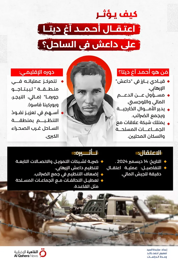 في يوم الاثنين الموافق 15 ديسمبر 2024، أعلن الجيش المالي تحقيق نصر استراتيجي حاسم، تمثَّل في إلقاء القبض على أحد القادة البارزين لتنظيم "داعش" الإرهابي في منطقة الصحراء الكبرى، "أحمد آغ ديتا"، خلال عملية عسكرية محكمة وممنهجة في منطقة ميناكا شمال شرق البلاد. يُعد هذا الإنجاز تحولًا جوهريًا في مساعي القوات المسلحة المالية لتقويض الوجود الإرهابي ودرء خطر التنظيمات المتطرفة عن الشعب المالي، ويكتسب الاعتقال أهميته الكبرى في سياق تزامنه مع استسلام 2 من عناصر التنظيم في منطقة جورما بالقرب من أنسونجو 14 ديسمبر 2024، أي قبل 24 ساعة من القبض على ديتا، ما يعكس نجاحًا ميدانيًا متصاعدًا للقوات المالية. هذه الانتصارات ليست مجرد مكاسب تكتيكية، بل تشكل ضربة استراتيجية قاسية تكبد تنظيم "داعش" في المنطقة خسائر فادحة، وتؤكد تفوق الجيش المالي في معركته ضد الإرهاب.