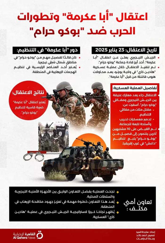 في خضم الصراع المعقد الذي تخوضه نيجيريا في حربها ضد الإرهاب، أعلنت السلطات النيجيرية في 23 يناير 2025 عن اعتقال القيادي "أبي عكرمة"، وهو ما يُعد تطورًا بالغ الأهمية في جهود الحكومة النيجيرية. إذ يُعد "أبو عكرمة" أحد الركائز الرئيسية التي ساهمت في دفع "بوكو حرام" نحو تنفيذ عملياتها الإرهابية المعقدة والدموية، ما جعله عنصرًا محوريًا في هيكل التنظيم الإجرامي. ولم يكن اعتقاله مجرد إجراء أمني عابر، بل يمثل ضربة استراتيجية مؤلمة للتنظيم، تُعيد رسم موازين القوة داخلها، وتُعد تحولًا حاسمًا قد يُفضي إلى إعادة ترتيب أوراق التنظيم في المرحلة المقبلة.