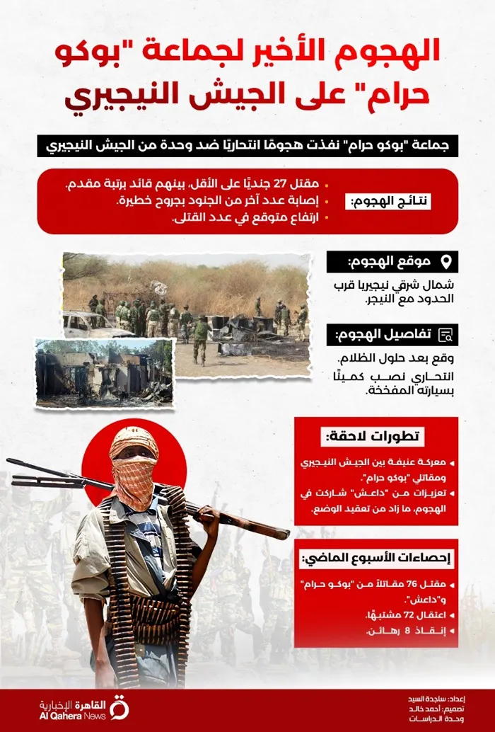 (&) رغبة الجيش النيجيري في استعادة بعض الأراضي تسيطر عليها "بوكو حرام": يسعى الجيش النيجيري إلى استعادة الأراضي التي تسيطر عليها جماعة "بوكو حرام" من خلال عمليات عسكرية منهجية تهدف إلى تفكيك الشبكات الإرهابية بشكل شامل، وتركز هذه العمليات على تعزيز قدرة القوات الأمنية في استعادة هيبة الدولة وحماية الشعب النيجيري، في مواجهة سعي التنظيم المتطرف لإقامة دولة خلافة في المنطقة.