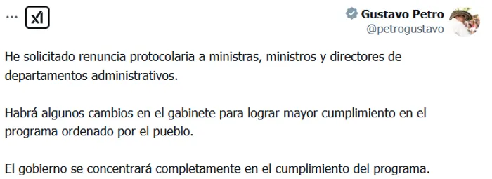 وكتب بيترو على منصة "إكس" طلبتُ استقالة الوزراء ومديري الدوائر الإدارية، وستكون هناك بعض التغييرات في مجلس الوزراء؛ لتحقيق قدر أكبر من الامتثال للبرنامج الذي طلبه الشعب.