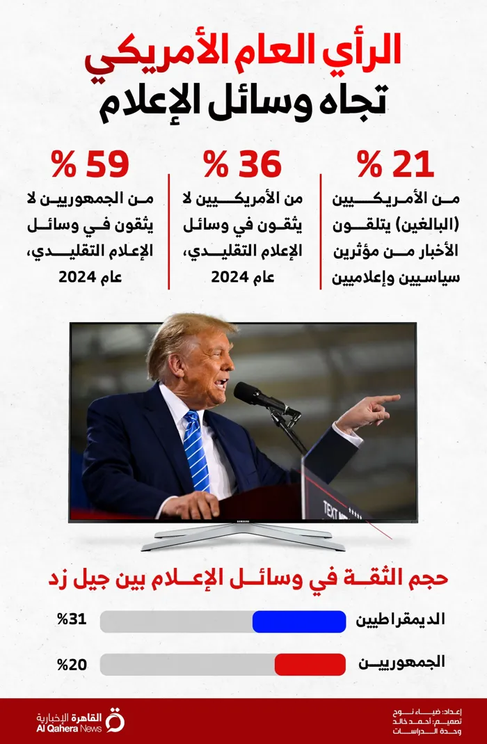 وتشير استطلاعات الرأي في الولايات المتحدة لانحدار كبير في مستويات ثقة الأمريكيين في وسائل الإعلام، خاصة الإعلام الإخباري على مدار 4 عقود مقابل صعود المؤثرين الأفراد، ومن بينهم الرئيس الأمريكي دونالد ترامب، وتظهر بيانات مؤسسة "جالوب" أن 36% من المستطلعة آراؤهم لا يثقون على الإطلاق في وسائل الإعلام، عام 2024، ارتفاعًا من مستوى 6% فقط، عام 1972، بينما انخفضت نسبة الثقة في أوساط الأمريكيين قبل 4 عقود من 68% إلى 31% فقط في 2024.