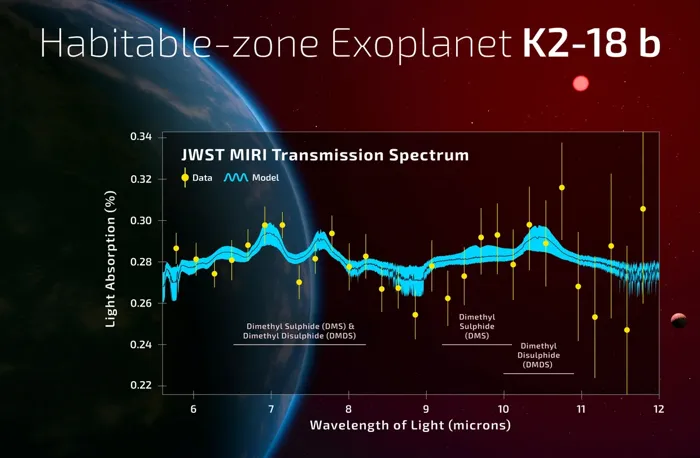 وباستخدام تلسكوب جيمس ويب الفضائي، بحسب شبكة سي بي إس نيوز، اكتشف فريق بريطاني أمريكي من الباحثين علامات على وجود مادتين كيميائيتين في الغلاف الجوي للكوكب، كان يُعتقد منذ فترة طويلة أنهما علامات حيوية تشير إلى وجود حياة خارج كوكب الأرض.