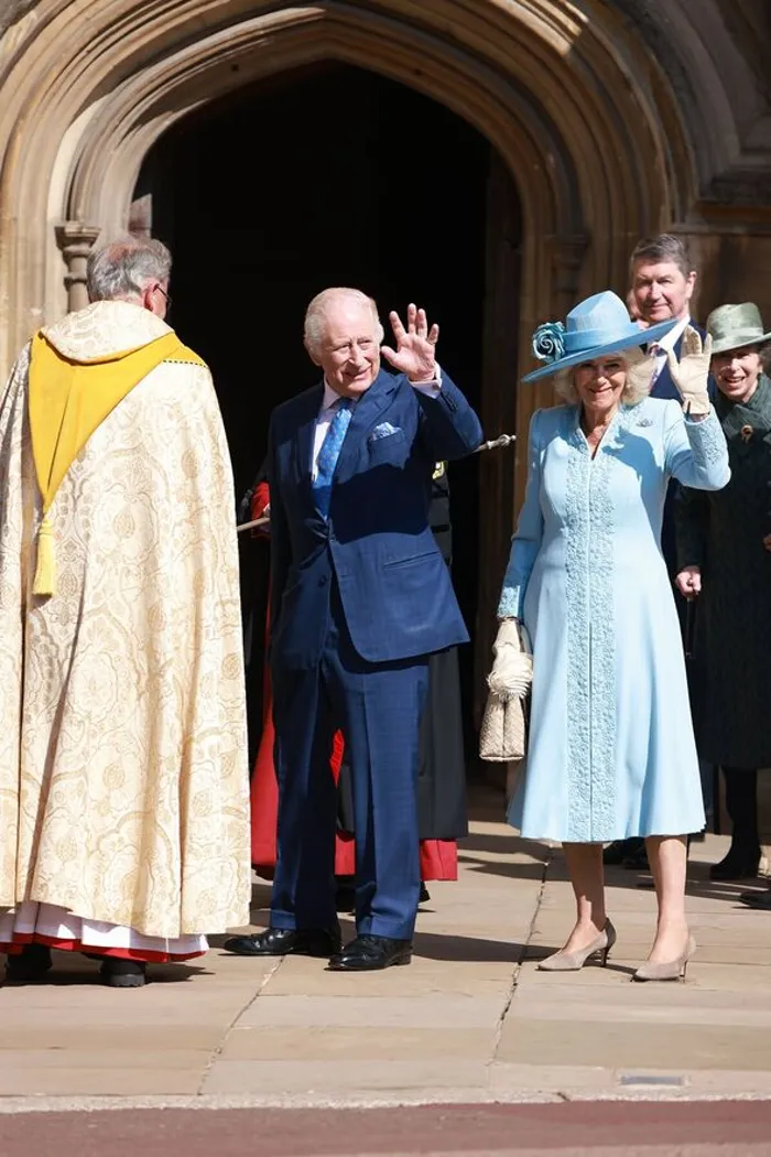 ولوّح تشارلز والملكة كاميلا، وابتسما للحشود المتجمعة خارج الكنيسة.