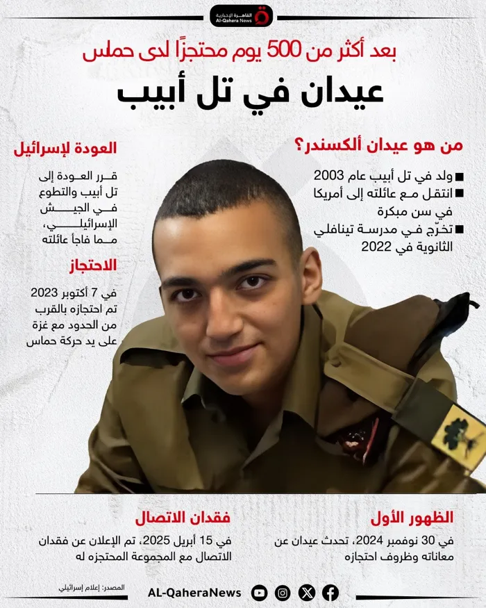 وفي وقت سابق، كشف مصدر مقرّب من حماس لوكالة "فرانس برس"، أنه سيتم الإفراج عن المحتجز الإسرائيلي الأمريكي عيدان ألكسندر اليوم أو غدًا الثلاثاء، مشيرًا إلى أن الحركة ستصدر بيانًا لإعلان الموعد الدقيق بعد تأمين الظروف الميدانية.