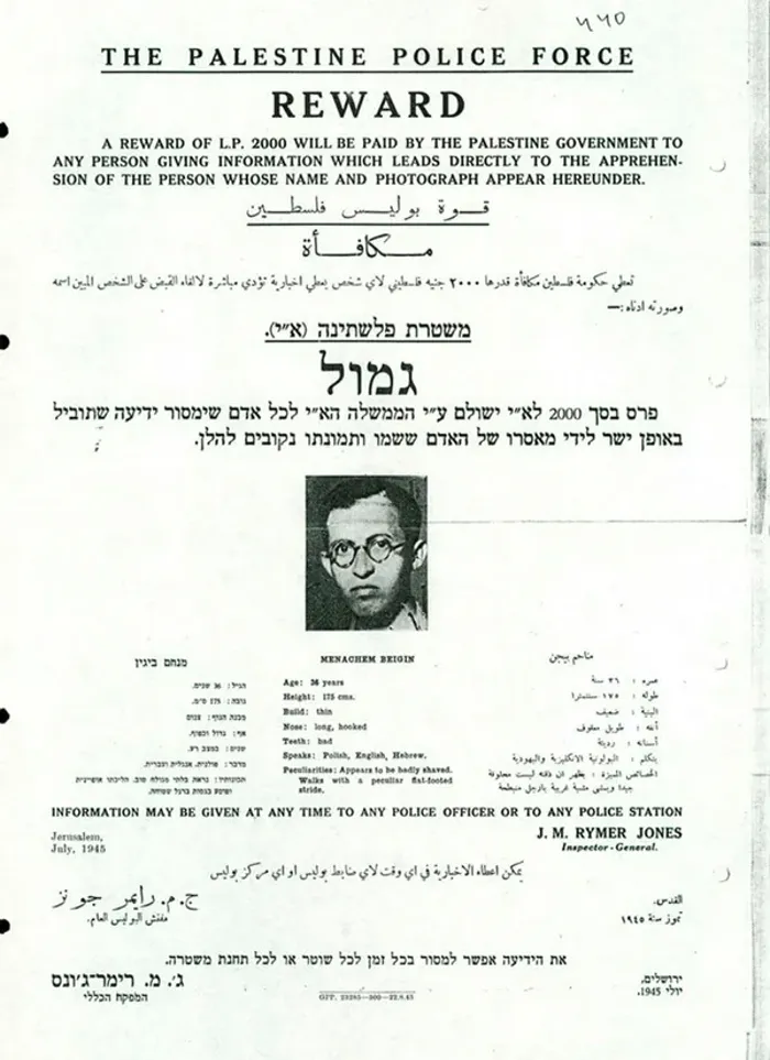 كما أشارت وثيقة سابقة من عام 1942 إلى أن أسنانه كانت "مُشوّهة، وأنفه طويل ومعوج". وكانت الشرطة "تبحث عنه"، وعرضت مكافأة لمن يُدلي بمعلومات عن مكانه، وتُشير الصفحة الثانية من الوثيقة إلى أن بيجن "أعلن رغبته في أن يكون ديكتاتورًا".