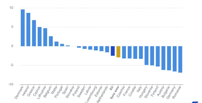 ووفقًا للشكل (3) سجل معدل التغير في الإنتاج الصناعي داخل بعض الدول الأوروبية معدلات سالبة، ففي بولندا بلغ (-0.4%)، السويد (-0.7%)، لاتفيا (-0.9)، لوكسمبورج (-1.1%)، وغيرها من الدول الأخرى كما يُشير الشكل.