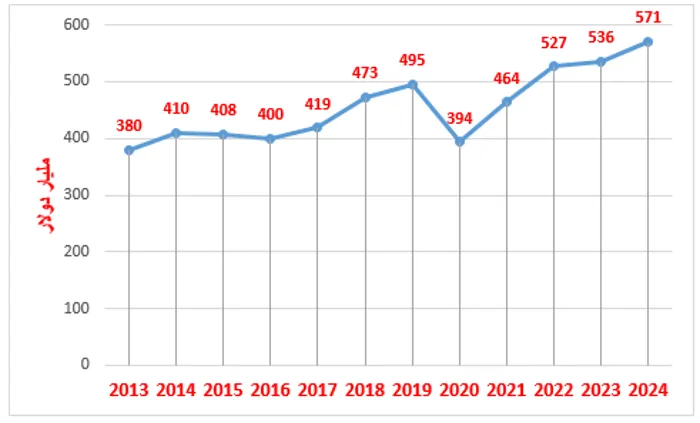(-) تهديد التجارة الأوروبية: يُعتبر الاتحاد الأوروبي أحد الشركاء التجاريين الرئيسين مع الولايات المتحدة الأمريكية، فكما يوضح الشكل (4) ارتفعت صادرات الاتحاد الأوروبي إلى الولايات المتحدة الأمريكية من 380 مليار دولار، عام 2013 إلى 571 مليار دولار، عام 2024، أي ارتفعت بمعدل نمو نسبته 50.26%، وهو الأمر الذي يوضح أن الاتحاد الأوروبي سيتأثر بشدة حال فرض الرسوم الجمركية.