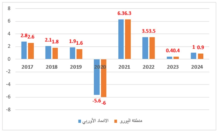 (-) تراجع معدل النمو الاقتصادي: تسبب العديد من العوامل في تراجع النمو الاقتصادي الأوروبي كما يوضح الشكل (1)، إذ بلغ 1% عام 2024 للاتحاد الأوروبي، و0.9% لمنطقة اليورو، مقارنة بـ6.3% لكل من الاتحاد الأوروبي ومنطقة اليورو عام 2021.