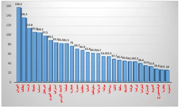 ووفقًا للشكل (2) يتضح الارتفاع الكبير في نسبة الديون من الناتج المحلي الإجمالي لكثير من الدول الأوروبية، خلال الربع الثالث من عام 2024، بالمُقارنة بالربع السابق من نفس العام، فهناك دول تعدت هذه النسبة فيها الـ100%، كما في اليونان، إذ بلغت 158.2%، وفي إيطاليا بلغت 136.3%، فرنسا 113.8%، بلجيكا 105.6%، وفي إسبانيا 104.3%.