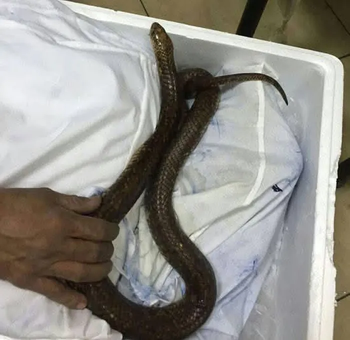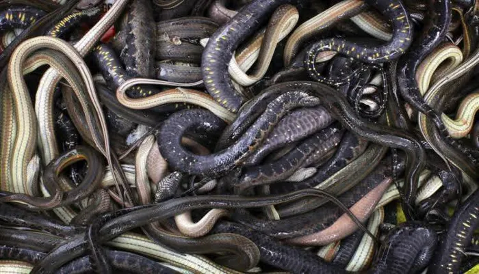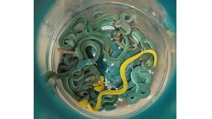 65 كائنًا حيًا من أنواع مختلفة، منها الكوبرا البخاخ، والأصلة البورمية، وثعبان الأمازون، والملك الأسود، وثعبان الذرة.
