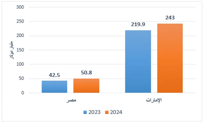 (-) إنعاش التجارة العالمية: إن تركيز مجموعة "بريكس" على تحقيق التنوع في التجارة العالمية بشكل يراعي متطلبات الدول النامية، سيحقق انتعاشًا كبيرًا للتجارة بين دول المجموع. ومن الشكل (2)، يتضح أن حجم تجارة دول المجموعة ارتفع بشكل كبير فيما بينها، فقد ارتفعت تجارة مصر مع مجموعة "بريكس" بنسبة 19.5% في عام 2024، إذ ارتفعت من 42.5 مليار دولار إلى 50.8 مليار دولار، وفي الإمارات ارتفع التبادل التجاري مع المجموعة بنسبة 10.5%، من 219.9 مليار دولار إلى 243 مليار دولار.
