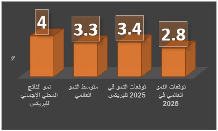 ووفقًا للشكل (1)، يتضح أن المجموعة بدأت في تخطي معدلات النمو العالمية، إذ بلغ معدل نمو الناتج المحلي الإجمالي بها 4% في عام 2024، بتوقعات نمو 3.4% في عام 2025، بينما بلغ معدل النمو العالمي 3.3%، بتوقعات نمو 2.8%، وهو ما يتضح أنه على الرغم من توقعات صندوق النقد الدولي بانخفاض النمو في كل من بريكس والعالم، فإن انخفاضه في المجموعة أقل بكثير من انخفاضه على مستوى العالم.