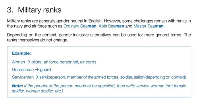 يشير نص الدليل الجديد إلى أن الرتب العسكرية عادةً ما تكون محايدة بين الجنسين في اللغة الإنجليزية "ومع ذلك، لا تزال هناك بعض التحديات المتعلقة برتب البحرية والقوات الجوية، مثل رتبة بحار عادي (Ordinary Seaman)، وبحار ماهر (Able Seaman)، وبحار رئيسي (Master Seaman)".