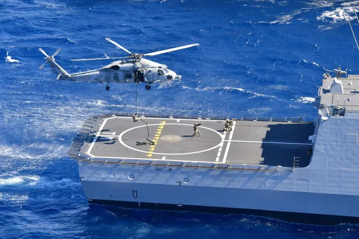 ويهدف التدريب إلى تعظيم الاستفادة من القدرات الثنائية لكلا الجانبين، وتبادل الخبرات في أسلوب تأمين مسارح العمليات البحرية ضد التهديدات المختلفة.
