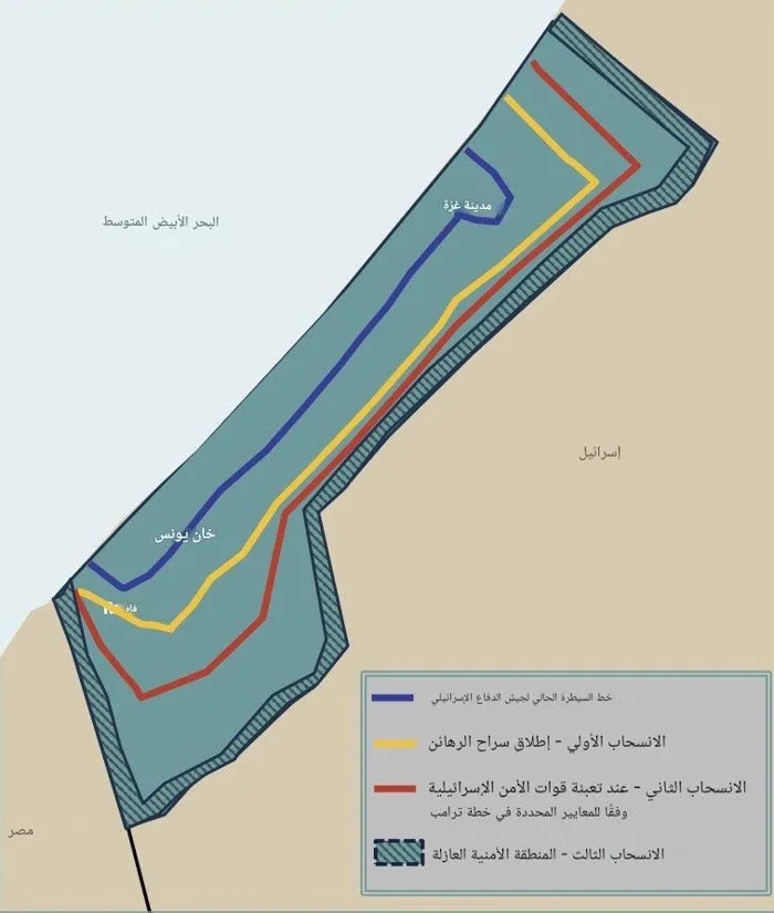 كشفت الخريطة التي نشرها البيت الأبيض عن أربعة خطوط توضّح مراحل الانسحاب التدريجي؛ إذ يمثّل الخط الأزرق نطاق سيطرة جيش الاحتلال الحالي، الذي يمتد من شمال القطاع إلى جنوبه بوجود عسكري واسع، بينما يوضّح الخط الأصفر "الانسحاب الأول" المرتبط بالإفراج عن المحتجزين، فيما يحدّد الخط الأحمر "الانسحاب الثاني" المتزامن مع نشر قوة استقرار دولية مؤقتة.