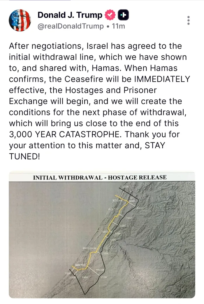 وكتب ترامب، اليوم السبت، على منصته للتواصل الاجتماعي "تروث سوشيال" : "بعد مفاوضات، وافقت إسرائيل على خط الانسحاب الأولي، الذي أطلعنا حماس عليه وأطلعناها عليه".