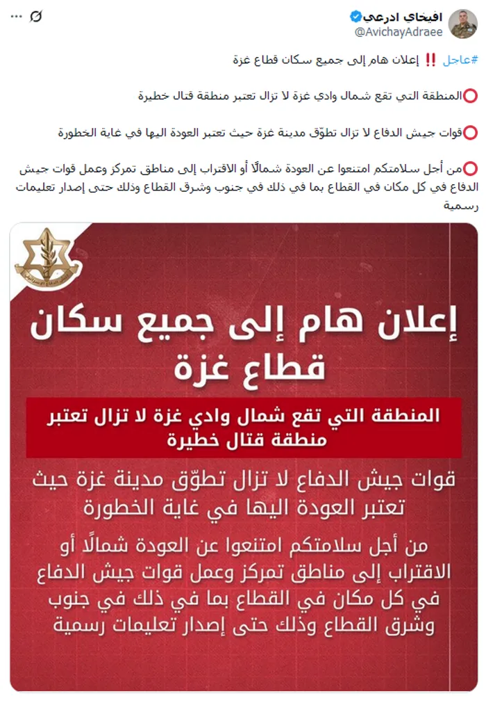 وذكر المتحدث باسم جيش الاحتلال أفيخاي أدرعي، في بيان على منصة "إكس"، اليوم الخميس، أنَّ المنطقة التي تقع شمال وادي غزة لا تزال تعتبر منطقة قتال خطيرة، مضيفًا أنَّ الجيش لا يزال يطوِّق مدينة غزة، حيث تعتبر العودة إليها في غاية الخطورة.