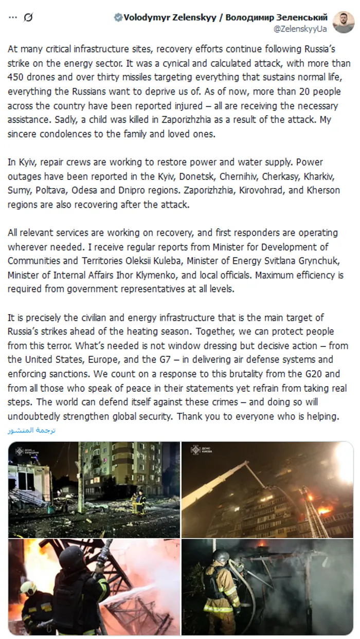 وجاءت تصريحات زيلينسكي على منصة "إكس"، في أعقاب هجوم واسع استخدمت فيه القوات الروسية أكثر من 450 طائرة مسيّرة وأكثر من 30 صاروخًا لاستهداف منشآت الطاقة والبنية التحتية المدنية.