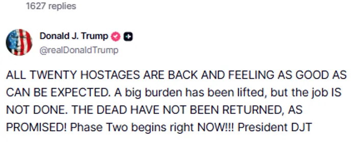 وكتب في حسابه على منصة "تروث سوشيال": "جميع المحتجزين العشرين عادوا وهم يشعرون بأنهم في أفضل حال لقد رُفع عبء كبير، لكن المهمة لم تنتهِ بعد،لم يُعاد الموتى كما وُعِدوا! المرحلة الثانية تبدأ الآن".