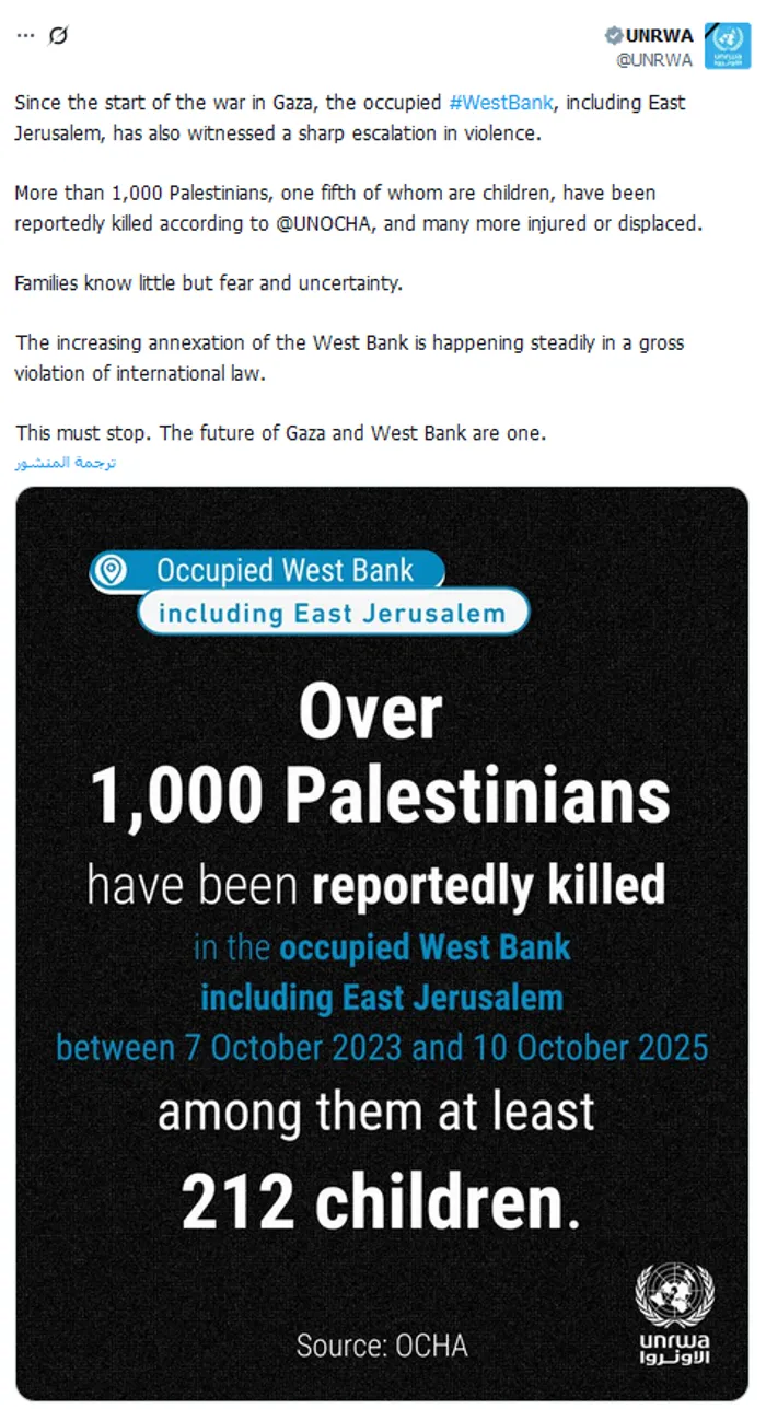 وحذّرت الوكالة التابعة للأمم المتحدة عبر منصة "إكس" من أن الضفة الغربية، بما فيها القدس الشرقية، تشهد تصعيدًا حادًا في العنف منذ اندلاع الحرب في غزة في أكتوبر 2023.