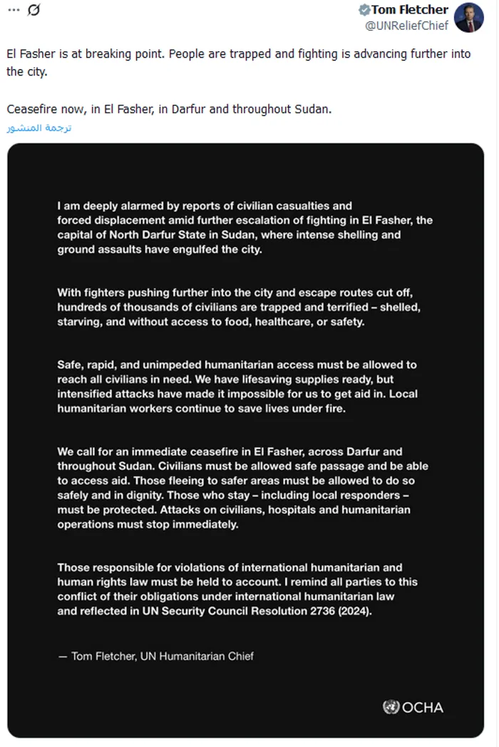 ووجّه رئيس الشؤون الإنسانية بالأمم المتحدة نداءً عاجلًا للمجتمع الدولي وأطراف النزاع، مطالبًا بوقف فوري لإطلاق النار في الفاشر، وعبر دارفور، وفي جميع أنحاء السودان.