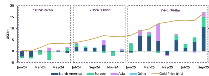 وبحلول نهاية الربع الثالث من عام 2025، بلغ إجمالي الأصول المُدارة لصناديق الاستثمار المتداولة في الذهب العالمي 472 مليار دولار أمريكي، أي بنمو 23% على أساس ربع سنوي، كما ارتفعت الحيازات بنسبة 6% إلى 3838 طنًا، وهو ما يوضحه الشكل (4)، والذي يظهر أن صناديق الاستثمار المتداولة شهدت أكبر تدفق شهري لها، سبتمبر 2025، ما أدى إلى أقوى ربع سنوي على الإطلاق بقيمة 26 مليار دولار أمريكي.