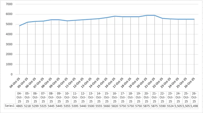 (-) أسعار الذهب المحلية: قفزت أسعار الذهب في مصر بشكل كبير، فكما يوضح الشكل (2) ارتفعت أسعار الذهب عيار 21 من نحو 4865، 4 أكتوبر 2025 إلى 5590، 22 أكتوبر 2025، أي ارتفع بنسبة 14.9% في أقل من شهر، وهو الأمر الذي يُشير إلى الارتفاع الملحوظ في أسعار الذهب في مصر، وعلى الرغم من تراجعها نسبيًا في أوقات معينة إلا أنها تعود إلى الارتفاع مرة أخرى بنسب أكبر.
