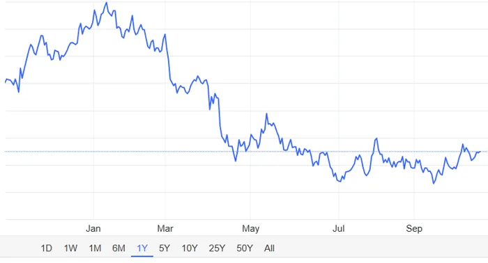 (-) تراجع الدولار الأمريكي: يُسعر الذهب بالدولار، وبالتالي توجد علاقة عكسية بين الذهب والدولار، أي عندما يضعف الدولار الأمريكي، يصبح الذهب أرخص لحائزي العملات الأخرى، فيزداد الطلب عليه، فكما يوضح الشكل (3) انخفض مؤشر الدولار الأمريكي من 104.43، 22 أكتوبر 2024 إلى 98.89 دولار، 22 أكتوبر 2025، وبمقارنة الشكلين (1 و3) تتضح العلاقة العكسية بين مؤشر الدولار وسعر الذهب، فمع ارتفاع مؤشر الدولار، 23 أكتوبر بنسبة 0.1%، انخفض الذهب بنسبة 0.3%، أي إلى 4082.95 دولار للأوقية (الأونصة).