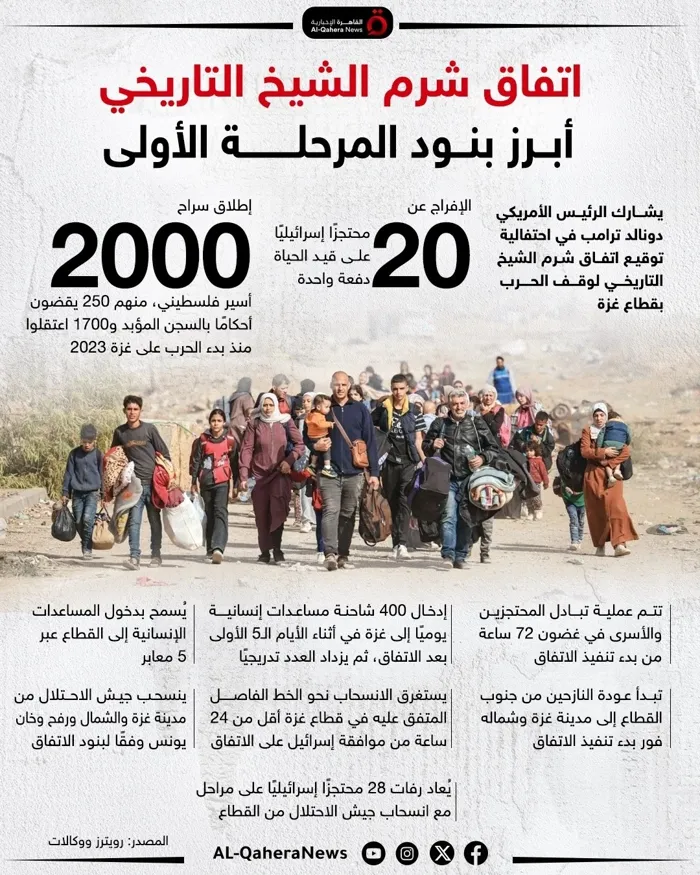 ومنذ توقيع الاتفاقية في جنوب سيناء، بحضور رؤساء دول عربية وغربية، عملت الدولة المصرية بقيادة الرئيس عبدالفتاح السيسي ، على جمع الأشقاء وتوحيد كلمة الفصائل الفلسطينية، والإشراف المباشر على تنفيذ المرحلة الأولى، التي عرضها الإسرائيليون للخطر عدة مرات.